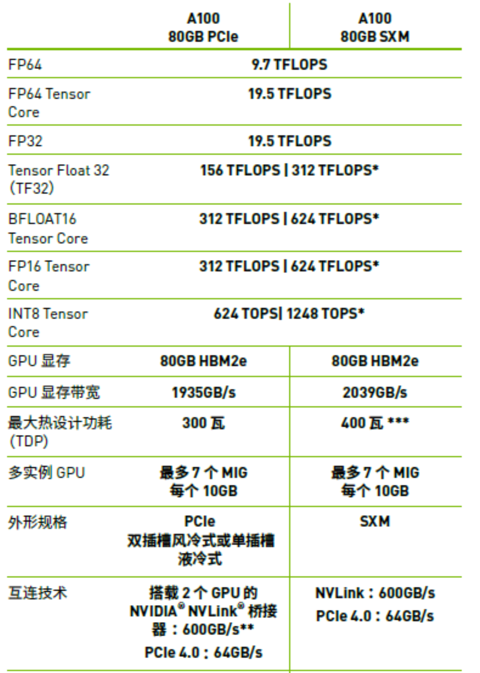 NVIDIA A100 Tensor Core GPU NVIDIA A100 Tensor Core GPU 可针对 AI、数据分析和 HPC 应用场景,在不同规模下实现出色的加速,有效助力更高性能的弹性数据中心。A100 采用 NVIDIA Ampere 架构,是 NVIDIA 数据中心平台的引擎。A100 的性能比上一代产品提升高达 20 倍,并可划分为七个 GPU 实例,以根据变化的需求进行动态调整。A100 提供 40GB 和 80GB 显存两种版本,A100 80GB 将 GPU 显存增加了一倍,并提供超快速的显存带宽(每秒超过 2 万亿字节 [TB/s]),可处理超大型模型和数据集。 NVIDIA A100 Tensor Core GPU 可在各个规模下为 AI、数据分析和高性能计算( HPC) 应用提供出色的加速性能,为全球的高性能弹性数据中心提供强劲助力。作为 NVIDIA 数据中心平台的引擎,与前一代 NVIDIA Volta™ 相比,A100 可使性能提升高达20 倍。A100 可高效扩展,也可借助多实例 GPU( MIG) 技术划分为 7 个独立的 GPU 实例,从而提供统一的平台,助力弹性数据中心根据不断变化的工作负载需求动态进行调整。 NVIDIA A100 Tensor Core 技术支持广泛的数学精度,可针对每个工作负载提供单个加速器。最新一代 A100 80GB 将 GPU 显存加倍,提供 2TB/s 的全球超快显存带宽,可加速处理超大型模型和海量数据集。 A100 是完整 NVIDIA 数据中心解决方案的一部分,该解决方案由硬件、网络、软件、库以及 NGC™ 目录中经优化的 AI 模型和应用等叠加而成。作为适用于数据中心且功能强大的端到端 AI 和HPC 平台,A100 可助力研究人员获得真实的结果,并能将解决方案大规模部署到生产环境中。 80GB内存,访存带宽达到2GB/s,FP64达到9.7TFlops。 A100比V100性能提升,80GB跟40GB相比性能有较大提升。 |