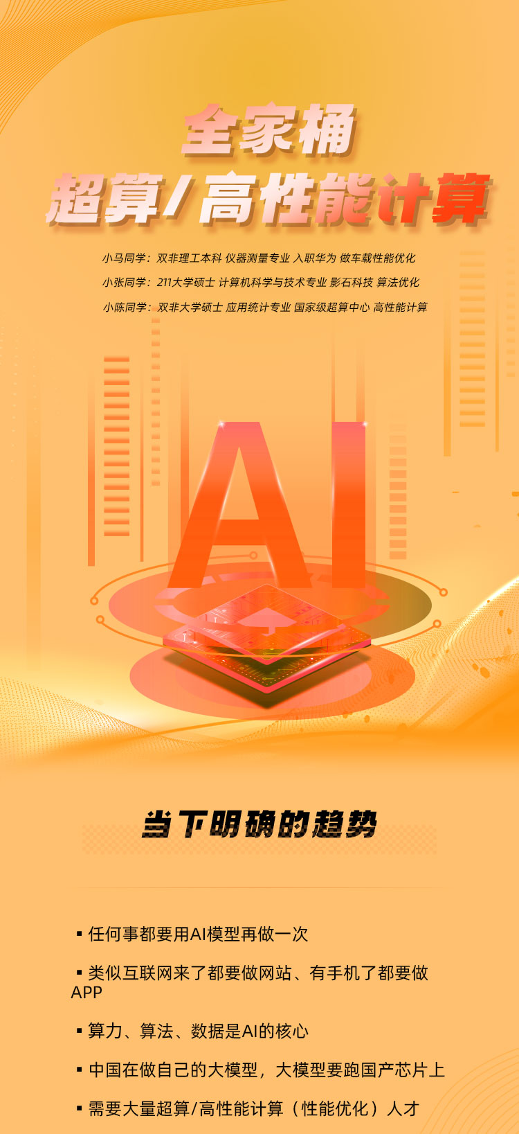 : AI时代必学,超算高性能计算全家桶!小马同学:双非理工 本科、仪器测量专业 入职华为 做车载性能优化小张同学:211大学 硕士、计算机科学与技术专业 影石科技 算法优化小陈同学:双非大学 硕士、应用统计专业 国家 ...