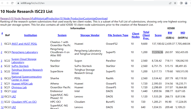 | 德国汉堡举办的ISC 2023高性能计算大会发布了最新IO500榜单,国家超级计算济南中心(以下简称“济南超算”)Cheeloo-1在10节点研究型榜单登顶夺冠,测试得分突破13万。济南超算以超越历史最佳纪录15倍的绝对优势,再次问鼎全球。 非常恭喜潘主任! ISC与SC是国际超算组织承办的具有悠久历史的两大高性能计算领域顶级会议,分别在每年的5月份和11月份,大会上发布当年超算领域的重要榜单,即TOP500,即HPL。超算实测计算性能排行榜、IO500和Green500。IO500主要是测试存储性能,Green500主要是测试计算功耗比。 |